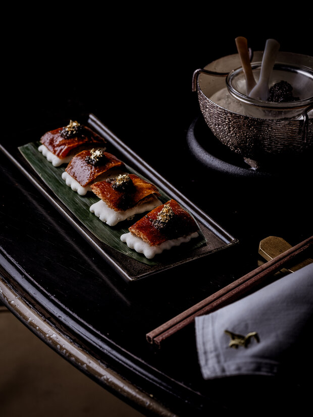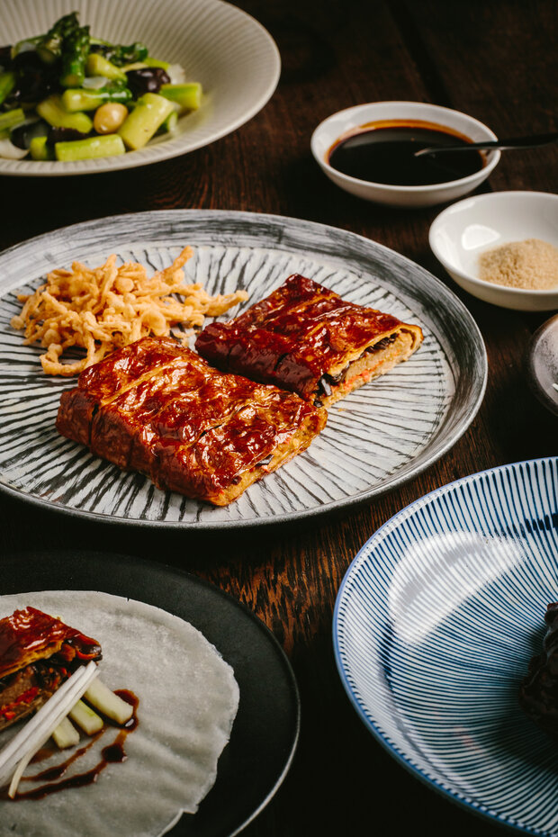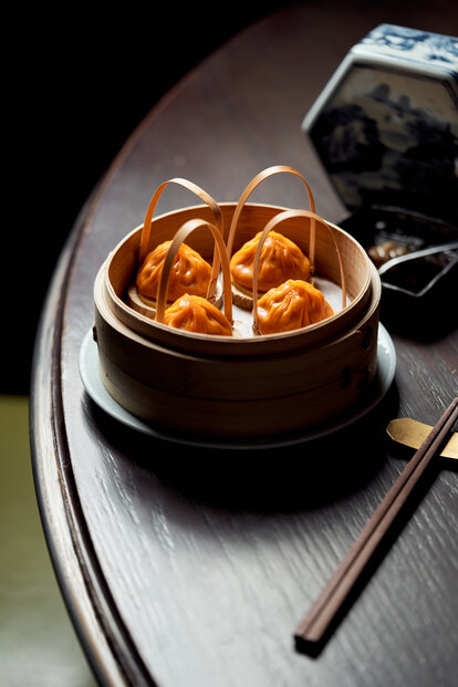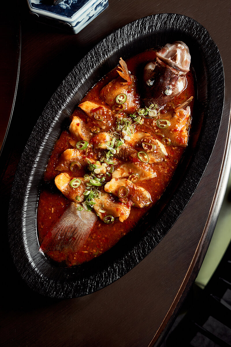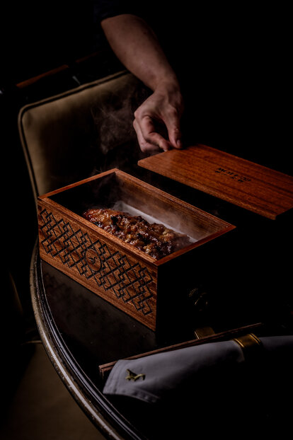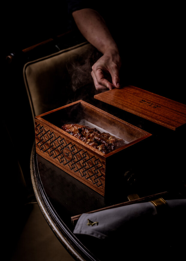 卅二公館的招牌北京片皮鴨(蘋果木燒)精心挑選四十二天飼養的香鴨,再由烹飪團隊獨創的方式製作,成功把所有肉汁鎖於其內,讓此成為真正的宮廷菜式。菜式將於賓客的餐桌旁奉上,配搭新鮮現蒸的餅皮、薄切青瓜、京蔥、蔗糖及自家製的海鮮醬。清爽多汁的青瓜,將與於你咬下香脆並帶煙燻味的鴨皮相輔相成,令整道菜式的味道昇華。